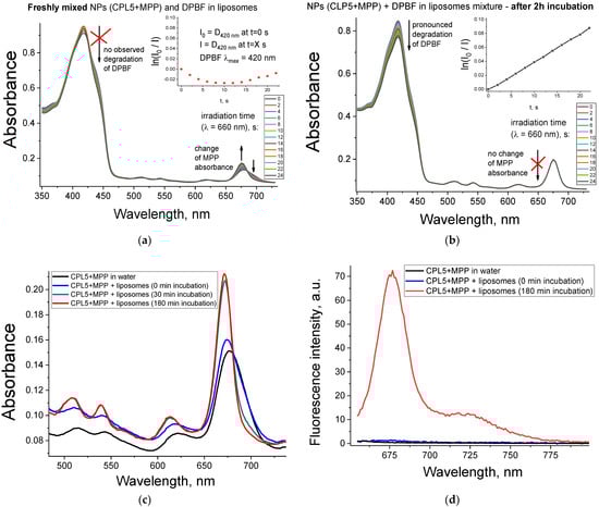 Interaction of CPL5 + MPP NPs with liposomes: absorption spectra of mixture for detection of singlet oxygen generation (DPBF probe encapsulated in lecithin liposomes)—freshly prepared (a) and after 2 h of incubation (b). The mixture of water solution of CPL5 + MPP immediately after addition to the lecithin liposomes solution (0 min) and after a certain incubation time (displayed in the legend)—absorption (c) and fluorescence spectra (d).