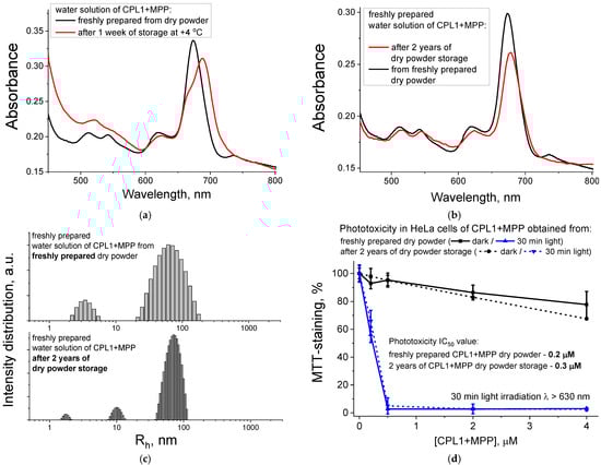 Properties of CPL1 + MPP freshly prepared and after storage time—absorption spectra after 1 week of solution storage at +4 °C (a) and a comparison of freshly prepared water solution from just obtained dry powder and powder stored for 2 years: absorption spectra, same MPP concentration (b), DLS profiles of NPs sizes, 20 °C (c), and phototoxic action (d).