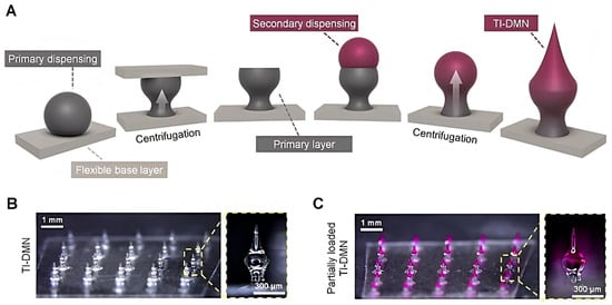 Schematic representation of hyaluronic acid-based tissue-interlocking dissolving microneedles. (A) Fabrication steps, (B) microscopic images, (C) microneedle partially loaded with Rhodamine B. Images reprinted with permission from [].