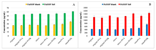 Furosemide is a weak bivalent acid with pKa1 = 3.53; pKa2 = 10.15 at 37 °C [26]. At pH = 6.5, where the compound is exclusively in the monoanionic form, its solubility is excellent, more than 10 mg/mL. At pH = 5.0, the ionization of furosemide is somewhat lower, but it is still predominantly ionized (HA−: 96.7% H2A: 3.3%). This change in the protonation state results in an approximately ten times lower equilibrium concentration. Because of the high solubility, the solubilizing effect of the SIF powder is limited: in the FaSSIF full buffer, it even impairs the solubility of the original and the micronized compound without excipients compared to the blank buffer. In the FeSSIF full, a significant solubility increase can be observed in all samples when it is compared to the blank buffer. Excipients in the physical mixtures of the original and the micronized compounds did not affect, or even slightly decreased the equilibrium concentration in FaSSIF buffers. In the case of nanoPVA and nanoPVPK samples, a solubility enhancement was observable, and there were no significant differences between the two samples. In the FeSSIF buffers, the PVPK excipient resulted in a higher solubility when added to the original and the micronized compound. Nanonization with PVA did not change the solubility, but the nanoPVPK sample had an outstanding equilibrium concentration (1.535 ± 0.0098 mg/mL in FeSSIF blank and 2.007 ± 0.025 mg/mL in FeSSIF full).