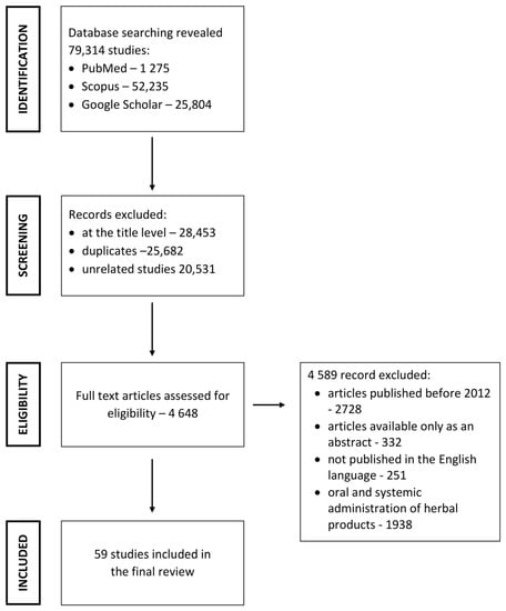 Overall, 79,314 articles were found in the databases. Of these, 74,666 articles were excluded at the title level; among them were also duplicates and unrelated articles. Furthermore, 4589 articles were excluded as not meeting the inclusion criteria. Finally, 59 articles were used for the review (Figure 1).