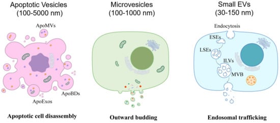 Graphic representation of the different types of extracellular vesicles (EVs). Generally, EVs are divided into apoptotic vesicles (ApoVs), microvesicles (MVs), and small EVs (sEVs) according to their biogenesis. ApoVs are released from disassembled apoptotic cells and are categorized as apoptotic bodies (ApoBDs), apoptotic microvesicles (ApoMVs), and apoptotic exosomes (ApoExos), based on their different sizes. MVs are generated via the direct outward budding of the plasma membrane. The biogenesis of sEVs comprises the formation of endocytic vesicles, early sorting endosomes (ESEs), late sorting endosomes (LSEs), and intraluminal vesicles (ILVs) within multivesicular bodies (MVBs), followed by release upon fusion of MVBs with the plasma membrane.