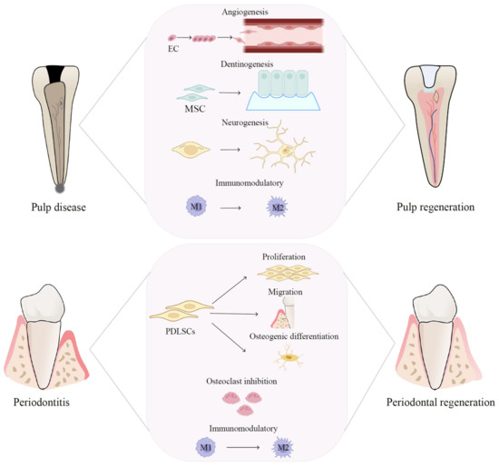 By modifying cellular behavior via affecting target cells in a paracrine or an endocrine manner, EVs can be used to treat multiple diseases, such as cancer, neurological diseases, and cardiovascular disorders [6]. Moreover, their therapeutic potential in oral disease has become a research hotspot [16,17]. In this paper, we will systemically review the current status of EVs in the treatment of pulp and periodontal regeneration in vivo and in vitro together with mechanistic analyses.