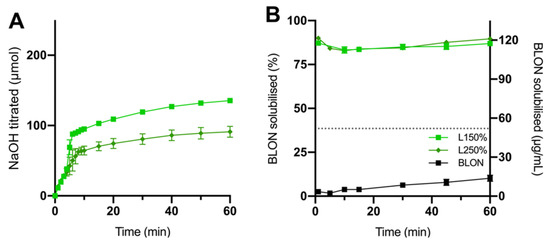 The (A) digestion profiles represented as NaOH titrated and (B) BLON solubilisation profiles during the in vitro lipolysis (pH 6.5) of liquid super-SNEDDS150% (light green square, L150%), liquid super-SNEDDS250% (dark green diamond, L250%), and pure BLON (black square). BLON Seq in undigested media is represented by the dotted line. Values represent the mean ± SD, n = 3. Data for crystalline BLON and liquid super-SNEDDS150% was previously reported by and is published with permission from [19].