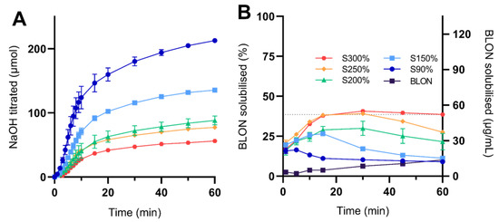 The (A) digestion profiles represented as NaOH titrated and (B) BLON solubilisation profiles during in vitro lipolysis (pH 6.5) of solid super-SNEDDS300% (red hexagon), solid super-SNEDDS250% (orange diamond, S250%), solid super-SNEDDS200% (green triangle, S200%), solid super-SNEDDS150% (light blue square, S150%), solid super-SNEDDS90% (blue circle, S90%), and pure BLON (black square), all dosed at the same BLON dose. BLON Seq in FaSSIF is represented by the dotted line. Values represent the mean ± SD, n = 3. Data for crystalline BLON and solid super-SNEDDS150% was previously reported by and is published with permission from [19].