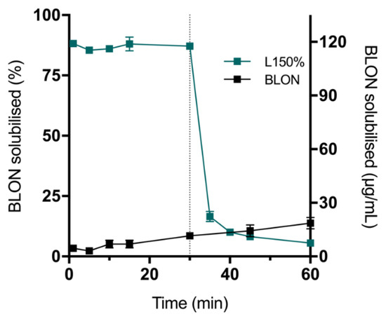 BLON solubilisation profiles during in vitro lipolysis (pH 6.5) of liquid super-SNEDDS150% (teal square, L150%) with silica added after 30 min (grey dotted line) and crystalline BLON (black square). Values represent the mean ± SD, n = 3. Data for crystalline BLON was previously reported by and is published with permission from [19].