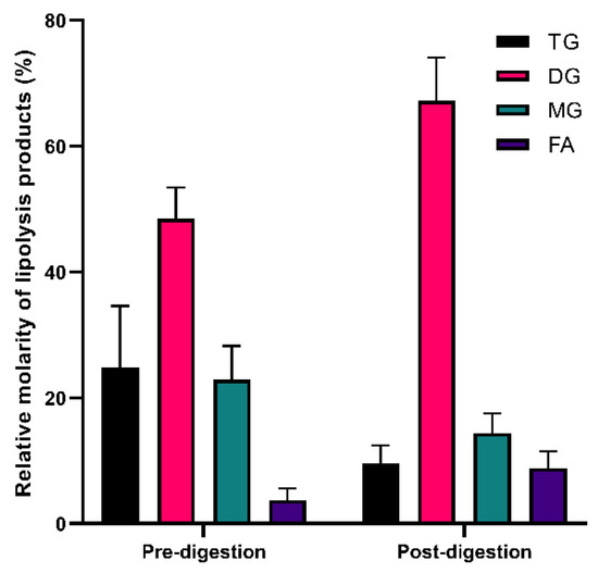 To further understand the lipolysis characteristics of the solid super-SNEDDS, NMR was used to quantify the relative lipolytic product adsorption for solid super-SNEDDS150% pre- and post-digestion (the lipolysis pellet) (Figure 6). The 1H NMR spectra of lipid species present in the solid super-SNEDDS pre- and post-digestion are provided in Figure S8. It was assumed that the dried pellet after 60 min of lipolysis contained lipid associated with silica. Pre-digestion, the lipid content of solid super-SNEDDS contained 25% TG, 48% DG, 23% MG, and 4% FA, whereas post-digestion it contained 10% TG, 67% DG, 14% MG, and 9% FA. As expected, the proportion of TG decreased after undergoing digestion. Post-digestion, the major lipolytic product present was DG, with relatively little MG and FA. This is in accordance with published data which demonstrated that TG and DG adsorb more strongly to silica than MG and FA; repulsive electrostatic interactions between the negatively charged silica, MG, and FA triggers the repulsion of MG and FA from the silica pores [28]. This likely limits the solubilization capacity of mixed micelles within the aqueous phase and prevented BLON from partitioning out of the porous silica, thus limiting aqueous BLON solubilisation from solid super-SNEDDS.