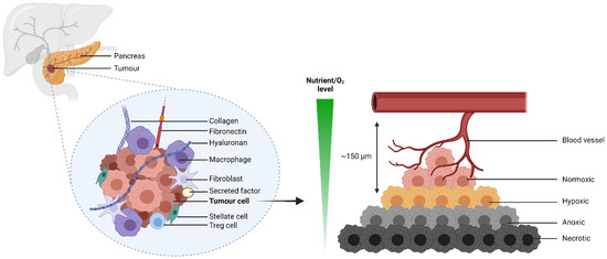 The desmoplastic stromal compartment of PDAC restricts perfusion of its tumor cells. 150 µm is the typical maximal diffusion distance of oxygen from the capillary bed to tissue [5,6]. Figure created with BioRender.com.