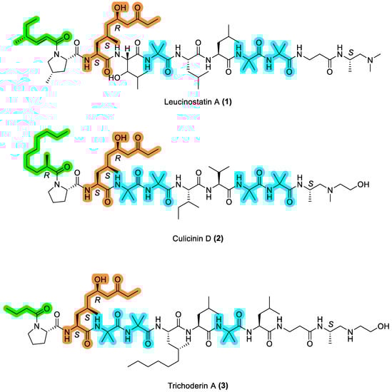 Comparative chemical structure of the AHMOD-containing aminolipopeptides leucinostatin A (1), culicinin D (2), and trichoderin A (3). Shared motifs are highlighted accordingly in color: N-terminus lipid tail (green), AHMOD (orange), Aib (blue).