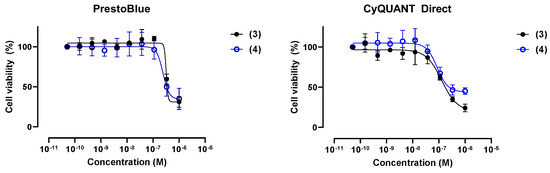The sensitivity of BxPC-3 cells to the native trichoderin A (3) and its simplified analogue (4) was examined under aerobic conditions in vitro by means of the orthogonal, fluorometric PrestoBlue™ and CyQUANT™ Direct Confirmation Assay [14]. BxPC-3 cells were seeded at a density of 7500 cells/well in Thermo Fisher Scientific (Waltham, MA, USA) Nunc MicroWell 96-Well Black Optical-Bottom Plates with Polymer Base (total volume: 100 µL). Cells were first incubated overnight at 37 °C, 5% CO2 to allow for adherence, and then exposed to both peptides (3) and (4) in duplicate at a concentration range of 50.8 pM to 1 µM for 72 h (threefold serial dilution in RPMI-1640 (ATCC modification, 25 mM glucose; ten steps). At the end of this incubation step, 11 µL of PrestoBlue™ Cell Viability Reagent was added into each well, and the plates incubated for 10 min. The endpoint fluorescence was read from the bottom of the plate at an excitation/emission (Ex/Em) wavelength of 560/590 nm on a SpectraMax iD3 Multi-Mode Microplate Reader (Molecular Devices, San Jose, CA, USA). The CyQUANT™ Direct Cell Proliferation Assay was subsequently performed by mixing the CyQUANT™ Direct nucleic acid stain, CyQUANT™ Direct background suppressor I, and PBS (pH 7.4) as per the vendor instructions [15], then adding 100 µL of this mixture into each well. The plate was returned into the incubator for a further 1 h, and the endpoint fluorescence bottom-read at the Ex/Em wavelength of 485/538 nm on the SpectraMax iD3 plate reader. Blank wells (medium only) and two negative controls—(1) cells + medium, (2) cells + medium + 0.3% v/v DMSO (equivalent to 1 µM peptide)—were set up in the plate for each experiment.