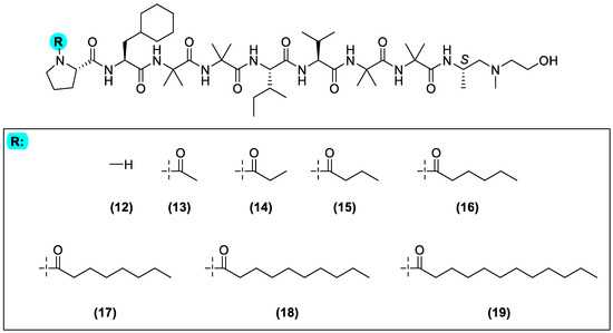 Having established a more synthetically tractable analogue of trichoderin A (3), we subsequently decided to explore the role of the N-terminus fatty acyl chain on its bioactivity. This study was initiated through the synthesis of trichoderin A analogues (12)–(19), varying in lipid chain length from C0 (12) to C12 (19) (Figure 6), following the protocol described in the preceding Scheme 1 (see also Supporting Information).