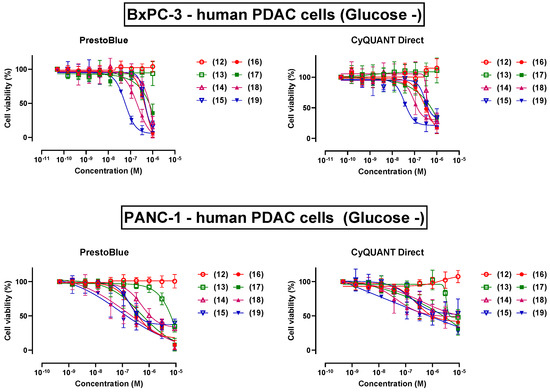 Comparative percent viability of BxPC-3 and PANC-1 cells cultured under ‘low glucose’ (Glucose −) following a 24 h exposure to trichoderin A analogues (12)–(19), as judged by the PrestoBlue™ and CyQUANT™ Direct assays.