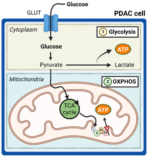 Cancer cells preferentially generate ATP via the fermentation of glucose to lactate, compensating for the relative inefficiency of this pathway to the mitochondrial oxidative phosphorylation (OXPHOS) pathway by increasing both glucose uptake and lactate secretion [22]. This observation, first reported by the German physiologist Otto Warburg in isolated tumor tissues, formed the basis for the ‘Warburg effect’ [23]. While initially thought to be due to mitochondrial dysfunction, certain cancer subtypes, including PDAC, have been established to contradict this notion by having intact mitochondria, and thus remain capable of producing ATP via OXPHOS (Figure 8) [24].