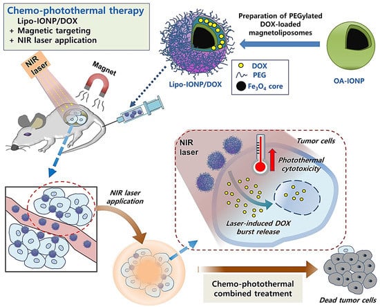 Scheme of the doxorubicin-loaded liposomal iron oxide nanoparticles for magnet-guided and light-triggered combined chemo-photothermal cancer therapy.