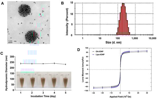 Physical characterization of Lipo-IONP. (A) Transmission electron microscopic (TEM) images of Lipo-IONP. (B) Hydrodynamic size distribution of Lipo-IONP. (C) Size stability of Lipo-IONP. (D) Superparamagnetic properties of Lipo-IONP measured by superconducting quantum interference device (SQUID) (Lipo-IONP: liposomal iron oxide nanoparticle).