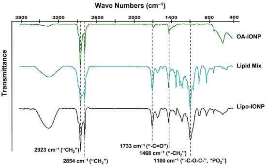 Fourier transform infrared (FT-IR) spectroscopic profiles of Lipo-IONP. The characteristic peaks of the samples are shown in dashed lines. The distinct peaks of the oleic acid composing OA-IONP (at 1733, 2854, and 2923 cm−1) and lipid mix (at 1100 cm−1) were identified from the FT-IR spectrum of the Lipo-IONP (Lipo-IONP: liposomal iron oxide nanoparticle).
