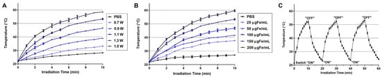 To verify the photothermal conversion capacity, the Lipo-IONP suspensions were prepared in Eppendorf tubes (at a fixed concentration of 150 μgFe/mL) and then irradiated with a diode laser (885 nm, spot size, 5 × 8 mm2, MDL-III-885, Changchun New Industries Optoelectronics Tech Co. Ltd., Changchun, China) at varying laser powers (0.7–1.5 W) for 10 min per each. On the other hand, the Lipo-IONP suspensions were also prepared at varying concentrations (0, 25, 50, 100, 150, or 200 μgFe/mL) in Eppendorf tubes and irradiated with the laser (885 nm) at a fixed laser power of 1.3 W for 10 min per each. In addition, to assess the photostability of the Lipo-IONP, the Lipo-IONP suspension (150 μgFe/mL) was irradiated by the laser at a switch on and off mode (a total of 3 cycles of laser switch “on” for 10 min followed by “off” for 10 min) at a laser power of 1.3 W. The temperature profiles of the Lipo-IONP suspensions were monitored using an infrared (IR) camera (FLIR Systems, E5, Boston, MA, USA).