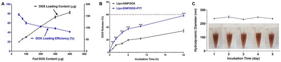 Loading and release of DOX and the size stability of Lipo-IONP/DOX. (A) DOX loading content and efficiency of the Lipo-IONP/DOX. (B) DOX release profiles with and without laser irradiation. (C) Size stability profiles of the Lipo-IONP/DOX. With increasing the DOX fed content, the DOX loading content increased, but, at the same time, the loading efficiency decreased. Based on the results, 200 μg of DOX feeding amount leading to a loading of 105 μg, was chosen for further studies. With laser irradiation above 47 °C (transition temperature of the liposome) for 10 min, a burst release of DOX was observed. A statistically significant difference between the groups was compared by Student’s t-test using Prism software (GraphPad). *** p < 0.001 (Lipo-IONP: liposomal iron oxide nanoparticle and Lipo-IONP/DOX: doxorubicin-loaded liposomal iron oxide nanoparticle).