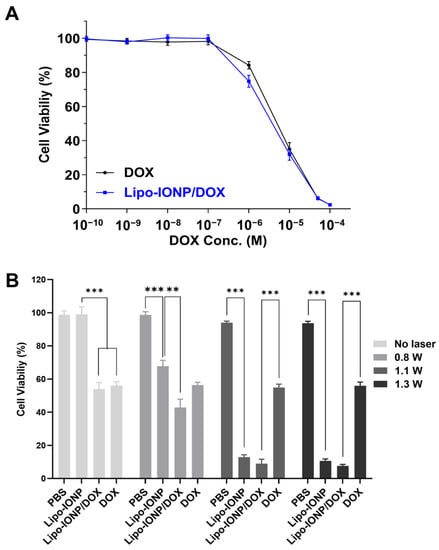 Cytotoxicity of Lipo-IONP/DOX. (A) Cytotoxicity profiles of Lipo-IONP/DOX versus DOX alone. (B) The viability of cells treated with Lipo-IONP, Lipo-IONP/DOX, and DOX with laser irradiation at different powers. The 0.8, 1.1, and 1.3 W were available to induce maximum medium temperatures of 40, 45, and 50 °C, respectively. The Lipo-IONP/DOX and DOX alone showed similar cytotoxicity levels. However, compared to Lipo-IONP, the Lipo-IONP/DOX elicited greater cytotoxicity. Of note, with laser irradiation at high powers (1.1 and 1.3 W), markedly enhanced cytotoxicity was observed from the cells treated with either Lipo-IONP or Lipo-IONP/DOX. In sharp contrast, the DOX-treated cells showed similar levels of cytotoxicity regardless of the laser application. A statistically significant difference among the groups was compared by 1-way ANOVA with Tukey’s multiple comparison test as the post hoc test using Prism software 9.0.2 (GraphPad). ** p < 0.01 and *** p < 0.001 (Lipo-IONP: liposomal iron oxide nanoparticle and Lipo-IONP/DOX: doxorubicin-loaded liposomal iron oxide nanoparticle).