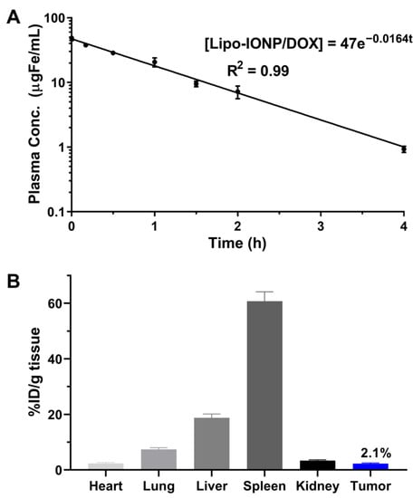After intravenous (i.v.) administration of Lipo-IONP/DOX to ICR mice (N = 5), the plasma concentrations of the particles at pre-determined time points were quantified by ICP-OES. The acquired plasma concentration-versus-time profile of Lipo-IONP/DOX is shown in Figure 7A. As seen, the curve for Lipo-IONP/DOX fitted well with the 1-compartment model. The calculated plasma half-life (t1/2) of the Lipo-IONP/DOX was 42 min, suggesting that lipid coating and further PEGylation could effectively stabilize the OA-IONP in the bloodstream.