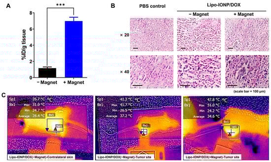 The feasibility of magnet-guided tumor targeting of Lipo-IONP/DOX was evaluated in the B16F10 s.c. tumor-bearing mice. When the average tumor size reached 300 mm3, the mice were divided into 3 groups (N = 5): (1) PBS, (2) Lipo-IONP/DOX, and (3) Lipo-IONP/DOX+MAG. The mice were administered with either PBS or Lipo-IONP/DOX (24 mgFe/kg; 4 mg/kg DOX) via tail vein injection after anesthetization with an i.p. injection of ketamine/xylazine mixture. For the Lipo-IONP/DOX+MAG group, an external magnetic field (magnetic field density: 320 mT) was locally applied for 30 min to the tumor region after the drug injection. For the magnetic targeting, a tandem-linked cylindrical neodymium magnet (D48-N52 [6.35 mm diameter × 12.7 mm thickness] and DY0Y0-N52 [51 mm diameter × 51 mm thickness]; K&J Magnetics Inc., Pipersville, PA, USA) was used according to Zhang et al. []. After 2 h post-administration, all the mice were euthanized. The tumor tissues were harvested and digested in 1 N nitric acid for 3 days. The digested tumor samples were sent for ICP-OES analyses to quantify the iron contents. The acquired iron contents were further subtracted by those of the tumors from the control mice, and the percentage of injected dose (I.D.) per g tissue was calculated for each sample. In addition, for histological analysis, some of the tumors were collected and fixed in 10% formalin. These tissue samples were dissected (8 µm thick) and embedded in paraffin. The sections were stained with Prussian blue (for IONP detection) and neutral red (for counterstain) to identify the presence of Lipo-IONP/DOX in the tumors [].