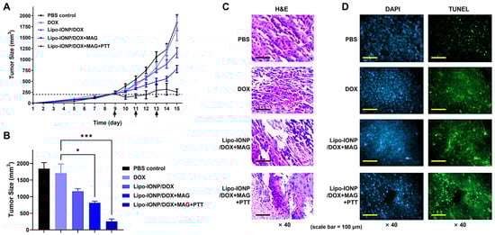 Nine days after tumor implantation (at day 9), when the average tumor size reached 200 mm3, the B16F10 s.c. tumor-bearing nude mice were divided into 5 groups (N = 5): (1) PBS-control, (2) DOX (4 mg/kg), (3) Lipo-IONP/DOX (24 mgFe/kg Lipo-IONP; 4 mg/kg DOX), (4) Lipo-IONP/DOX with magnetic targeting (Lipo-IONP/DOX+MAG), (5) Lipo-IONP/DOX with magnetic targeting & PTT (Lipo-IONP/DOX+MAG+PTT). For groups 4 and 5, the mice were anesthetized and, after i.v. injection of the Lipo-IONP/DOX, a magnet was locally applied to the tumor regions for 30 min. For group 5, after magnetic field application, at 2 h post-administration, a laser was irradiated to the tumor region for 10 min with 0.7 W power, respectively. These laser powers were chosen to acquire a maximum tumor temperature of about 50 °C. The treatment was carried out three times on Days 9, 11, and 13, and the study continued until the average tumor size of the PBS-control group was above 1500 mm3. After the efficacy study was terminated, the mice were euthanized, and the major organs (e.g., tumor, liver, spleen, kidney, and lung) were collected and fixed in 10% formalin. These tissue samples were dissected (8 µm thick) and embedded in paraffin. The sections were stained with hematoxylin and eosin (H&E) to observe nucleic acids and cytoplasms using a previously reported method []. In addition, specifically, terminal deoxynucleotidyl transferase dUTP nick end labeling (TUNEL) assay was further carried out for the tumor tissue sections to observe the presence of tumor cell death. The DeadEnd fluorometric TUNEL system (Promega, Madison, WI, USA) was used for labeling apoptotic bodies in tumor sections cover-slipped with a mounting medium, following the manufacturer’s protocol. DAPI dye was used for counterstaining the cell nuclei. The specimens were examined under the DAPI and FITC channel using the Zeiss Axio Observer Z1 fluorescence microscopy (Carl Zeiss MicroImaging GmbH, Jena, Germany).