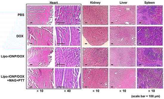 Histological analysis of the major organs after the efficacy study. The images showed no apparent toxicity from any of the major organs of all the experimental groups. Heart, kidney, liver, and spleen tissues were removed from the mice of each group and stained by H&E: mice groups are (1) PBS-control, (2) DOX (4 mg/kg), (3) Lipo-IONP/DOX (24 mgFe/kg as Lipo-IONP; 4 mg/kg as DOX), (4) Lipo-IONP/DOX+MAG+PTT (24 mgFe/kg as Lipo-IONP; 4 mg/kg as DOX). For the Lipo-IONP/DOX+MAG+PTT group, the mice were administered with Lipo-IONP/DOX and then followed by magnetic targeting and photothermal treatment (Lipo-IONP/DOX: doxorubicin-loaded liposomal iron oxide nanoparticle).