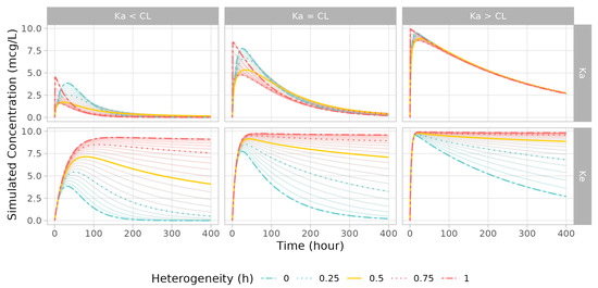 In the simulation in which the one-compartment model’s absorption rate (Ka) was modified to a fractionally modified rate, when the heterogeneity exponent h value was in the range of 0.75–0, the lower peak concentration appeared earlier. When the h value was in the range of 1–0.75, the concentration increased, and the time point to the peak was reached near 0. By contrast, in the case in which the elimination rate (Ke) was adjusted, a larger h resulted in a faster decrease in elimination rate. As a result, the drug amount in the central compartment became trapped, and the concentration stopped moving from a certain point determined by h and its corresponding rate constant value. Changes in PK patterns were more pronounced when the fractionally modified parameter was slower than the other rate constants (Figure 2).