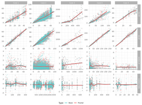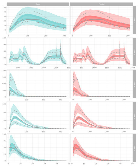 The prediction confidence intervals of the fractal model tended to be lower in Model Cases 1, 2, and 5 than that in the base model. This implies that the fractional expression can improve interindividual model misspecification, by narrowing the width of the confidence interval, if the misspecification did not originate from uncontrolled variance of the data itself. Although the performance metrics were improved, the confidence intervals could increase, as they better reflect the variance in the observations. The fractal rate can improve the -shrinkage [24], a measure of the agreement between the observed and model-specified variances. The normalized prediction distributions of the models were not impaired by fractal rate introduction. In all cases, there were improvements on kurtosis, variance converged to 1, and the model prediction errors were better shaped following the normal distribution.