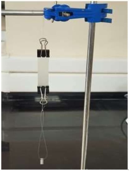Young’s modulus: To determine the modulus of elasticity (Young’s modulus (E)), a thick film was prepared in a mold. A rectangular piece was cut from it. The cross-sectional area (A) was calculated in m2. A paperclip was clamped to both ends of the rectangle sheet (Figure 3). The initial length (L○) between the two clamps was measured. Weights were attached to the lower clamp, and the increase in length (∆L) was calculated. The force (F) in Newtons (n) was calculated by multiplying the weights in kilograms by the acceleration due to gravity. The weights were removed and the length was re-measured to check whether the film had returned to its initial length or not, and to ensure that the film was remaining in the elastic region with no deformation. We increased the hanging weights gradually and recorded the increase in the length until the increase was significantly greater for the hanging weights. By using Equation (2), and from the stress–strain curve, the value of E was calculated. It was obtained from the slope of the straight line during the elastic region in the stress–strain curve [36].