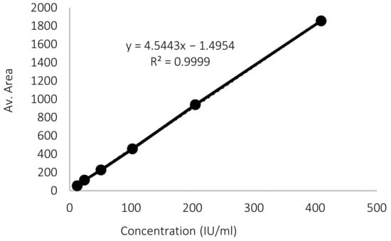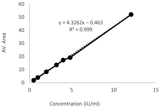 Plotting the concentration against the corresponding average peak areas in Figure 4 and Figure 5 showed the regression line equation for calibration curves. The R2 for low and high vitamin D3 calibration curves were very close to 1. This indicates a linear relationship between the concentrations and peak areas over the ranges 0.49–12.05 IU/mL and 12.3–409.4 IU/mL, respectively.