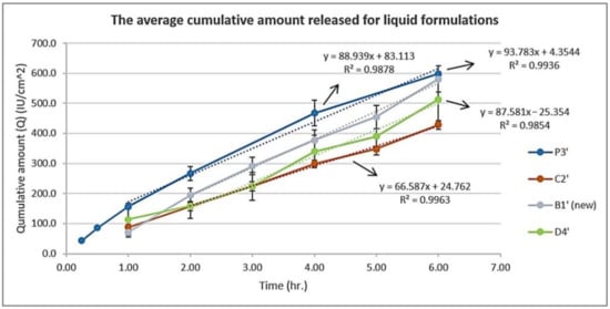The average cumulative amount released per unit area vs. time for liquid formulations (P3′, C2′, B1′ (new), and D4′).
