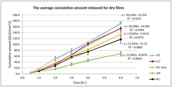 Figure 6 shows the release from liquid formulations. The amount released in six hours was the highest in the case of the P3′ liquid formulation. The increase in the percentage of Eudragit L100-55 may have counteracted the driving force formed by saturation and masked the effect of the hydrophilic polymer PVP which was expected to promote the release. The same thing was seen in D4′ where the Eudragit percentage was 8%. EM with OA in D4′ and Limonene in C2′ had a negative effect on the amount released; this may be due to the hydrophobic nature of these agents that favors the solubilization of the hydrophobic vitamin D3 in the formulation, thus delaying its release. Figure 7 shows the release from dry films. The amount released from the polymeric film #1′ which contained Eudragit L100-55 5% and vitamin D3 (6000 IU/mL) without any other components was used as a reference. The use of PG alone in the P3′ film had the highest release in unit time, as seen previously in the liquid state. In addition to PG’s solubilizing and plasticizing effects, it also acts as a penetration enhancer [31]. Vitamin D3 is sparingly soluble in PG [16], while it is considered soluble in the receptor fluid ethanol, PBS pH 7.4 (110.22 ± 3.02 μg/mL) [24]; this promotes the release of vitamin D3 and its penetration through the polyamide membrane to reach the receptor fluid where it is more soluble under sink conditions. The release from C2′ and B1′ (new) films was also better than that for the #1′ film. However, in comparison with P3′, the addition of Limonene in C2′ and the increase in the total polymer concentration in the B1′ (new) film reduced the release rate. The combination of the EM and OA together with increasing polymer concentration in the D4′ film had a negative effect on the release.