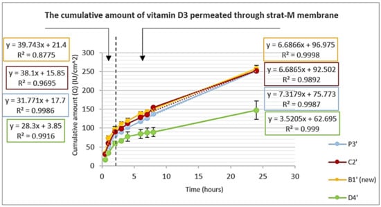 Compared with P3′, the addition of Limonene or PVP in C2′ and B1′ (new), respectively, had no significant effect on the amount permeated (Q). However, the addition of EM and OA at D4′ decreased the release rate. The Q permeated (after 24 h through S = 3.14 cm2) from P3′, C2′, and B1′ (new) was significant (about 800 IU under the experimental conditions), while in case of D4′, the Q permeated decreased nearly by half. This can be explained by the ability of EM and OA to dissolve vitamin D3 in relatively significant amounts, which counteracts the main driving force of penetration.