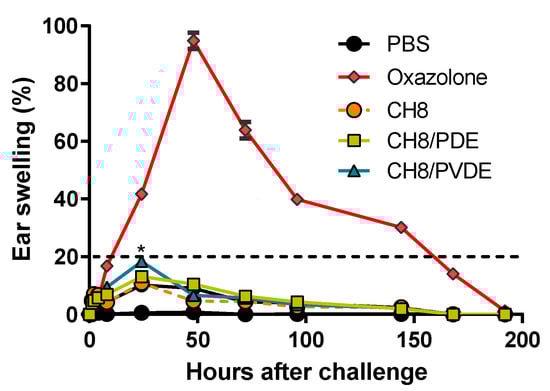 The mouse ear swelling test (MEST) following ear injection. Mice were given three s.c. injections in the rump with 10 μL of PBS or 30 μg of free CH8, CH8/PDE and CH8/PVDE on days −9, −7 and −5, and then challenged on day 0 with a homologous injection in the ear pinnae. Oxazolone (positive controls) was topically applied in the same sites (100%, 0.25 mm). Ear swelling was measured at the indicated times with a micrometer. The dotted line represents 20% of maximum oxazolone response. * p < 0.05 compared with PBS. Means ± SEM (n = 5).