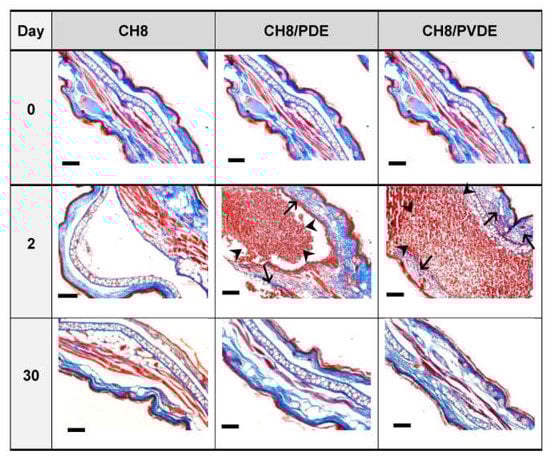 For histopathology and biodegradation, a single s.c. injection with CH8 or MPs was given in the ear pinnae, and these were processed after 2 and 30 days. Figure 3 shows that after 2 days, abundant CH8/PDE and CH8/PVDE were visible at the injection site (arrowheads), as well as some inflammatory infiltrates (arrows), compatible with Figure 2. After 30 days, the MPs were unseen (biodegraded), inflammatory infiltrates had disappeared, and ear sizes had returned to normal.