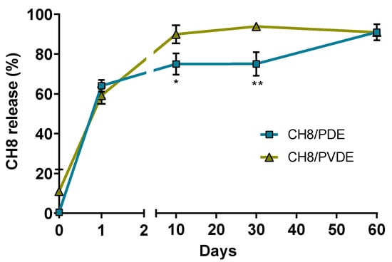 The drug-release kinetics at the injection site indicated that both CH8/PDE and CH8/PVDE MPs presented a biphasic curve, as expected for PLGA MPs [], with an initial burst release in the first 24 h followed by a slower release up to 60 days. CH8/PVDE showed a faster release profile than CH8/PLGA, compatible with other studies demonstrating accelerated drug release from nanoparticles and other MPs when PLGA is blended with PVP [,]. This effect can be explained by the higher PVP dissolution in contact with an aqueous medium in relation to PLGA, leading to the formation of pores in the MPs [,] that allow the water to get into the MPs, resulting in faster drug release [].