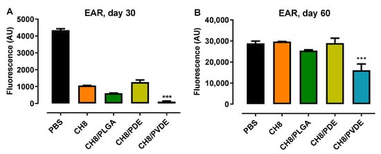 L. (Leishmania) amazonensis-infected mice: BALB/c mice were infected in the ear with 2 × 106 promastigotes of L. amazonensis (MHOM/BR/75/Josefa strain) transfected with green fluorescent protein (GFP) []. After 7 days of infection, the animals were treated with a single intralesional injection with CH8, CH8/PDE or CH8/PVDE (all at 30 μg of CH8 in 10 μL of PBS = 1.3 mg of CH8/Kg of body weight). Controls received 10 μL of PBS alone. On days 30 and 60 posttreatment, animals were euthanized by isoflurane inhalation, the ears removed from the base, ground in 1 mL of PBS and the fluorescence in the debris-free cell suspension measured by plate fluorimetry (435 nm excitation and 538 nm emission—FLx800, Bio-Tek Instruments, Inc., Winooski, VT, USA) for determination of L. amazonensis loads [].