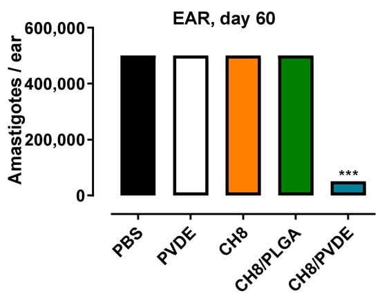 L. (Viannia) braziliensis-infected hamsters: Golden hamsters were infected in the ear with 105 promastigotes of L. braziliensis (MCAN/BR/98/R619). Seven days later, the animals were given a single intralesional injection with CH8, CH8/PDE or CH8/PVDE (all at 120 μg of CH8 in 40 μL of PBS = 1.3 mg of CH8/Kg body weight). Controls received 40 μL of PBS alone or blank PVDE MPs. On day 60 posttreatment, animals were euthanized, and the infected ears were individually ground and assayed by limiting dilution assay (LDA) for determination of parasite loads [].