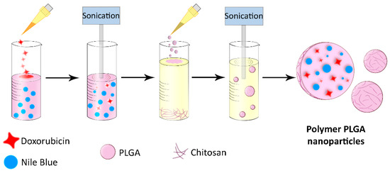Nanoparticles were synthesized by the double emulsion “water-oil-water” method with subsequent evaporation of the solvent, as shown in Figure 2. The first emulsion was obtained by the addition of water doxorubicin solution to the solution of PLGA and Nile Blue in chloroform, followed by a short sonication. The second emulsion was obtained by the addition of the first emulsion to the PVA solution containing 1 g/L of chitosan oligosaccharide lactate, followed by the second short sonication. After chloroform evaporation by the slow mixing, nanoparticles were centrifugated and resuspended in PBS.