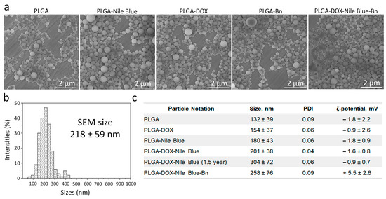 Electron microscopy images of PLGA nanoparticles loaded with Nile Blue and doxorubicin were obtained with a MAIA3 (Tescan, Brno, Czech Republic) microscope at an accelerating voltage of 15 kV. The samples were deposited onto a silicon wafer and then dried in the air. The resulting images were processed using ImageJ software to obtain a particle size distribution.