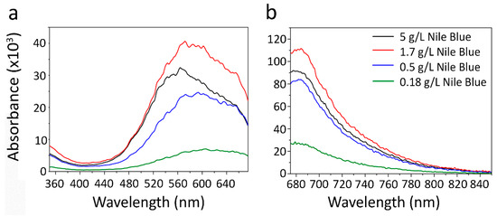 The effective incorporation of the fluorescent dye Nile Blue was investigated by fluorescence spectroscopy by measuring the excitation and fluorescence emission spectra of nanoparticles. The excitation spectra were measured in the range from 350 to 675 nm (with emission measured at 700 nm). Four PLGA nanoparticles with different Nile Blue concentrations used in the synthesis were investigated. The excitation and emission spectra (Figure 5) demonstrate that the most effective Nile Blue concentration during the synthesis is 1.7 g/L, the further scaling up of Nile Blue concentration leads to a decrease in fluorescence intensity. It is most probably caused by non-fluorescent H-aggregate formation with an absorption shifted to the blue region of the spectrum. The nanoparticle tracking analysis showed the size of nanoparticles to be equal to 231 nm, 227 nm, 189 nm, 181 nm for particles with 5 g/L, 1.7 g/L, 0.5 g/L, 0.18 g/L of Nile Blue used in the synthesis, respectively (Figure S1). These data show that the Nile Blue concentration significantly affects the nanoparticle size and must be considered when developing scalable methods for the synthesis of nanoparticles for in vivo injections.