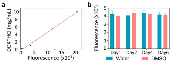 The efficient incorporation of doxorubicin was investigated by fluorescent spectroscopy on nanoparticles that do not contain Nile Blue. Nanoparticles were dissolved in DMSO and then fluorescence was measured using a fluorescence calibration curve for doxorubicin samples in the same solutions (Figure 6a). The measurement of the fluorescence of the samples showed that doxorubicin incorporation was 0.9 nmol doxorubicin per 1 mg of nanoparticles. The stability of fluorescence of the synthesized nanoparticles loaded with doxorubicin and Nile Blue was investigated for 1 week, both in water and DMSO; the data presented in Figure 6b confirm that the particles do not bleach during storage at room temperature in a plastic tube without light protection at least for one week (no further observations were performed).