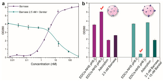 Functional activity of PLGA nanoparticles conjugated with barnase and barstar proteins. (a) The enzymatic activity of barnase (purple curve) and barstar (green curve) versus protein concentration. Optical density at 260 nm corresponds to the concentration of free mononucleotides obtained by barnase digestion of yeast RNA (for barnase activity) and by barstar pre-incubated with 2.5 nM of barnase (for barstar inhibition activity). (b) The enzymatic activity of PLGA conjugates with barnase (purple bars) and barstar (green bars). Data is presented for conjugates obtained at pH 8.0, pH 6.0, and by non-covalent protein absorption on the particle surface. Optical density (OD260) corresponded to the concentration of free mononucleotides was measured at a wavelength of 260 nm. The “√” symbol refers to the conjugation methods that were selected for further work.