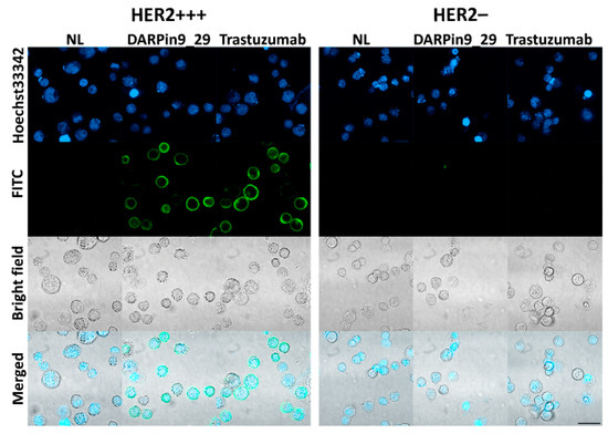 Confocal laser scanning microscopy of SK-BR-3 and CHO cells, labeled with DARPin9_29-FITC and Trastuzumab-FITC. Bottom panels—bright-field images, top panels—fluorescent images of the cells labeled with FITC-conjugated proteins, and Hoeschst33342. Scale bar, 50 µm.