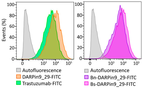 Flow cytometry of SK-BR-3 cells, labeled with DARPin9_29-FITC, Trastuzumab-FITC, Bn-DARPin9_29-FITC, and Bs-DARPin9_29-FITC in the fluorescence channel FL1 corresponding to FITC fluorescence.