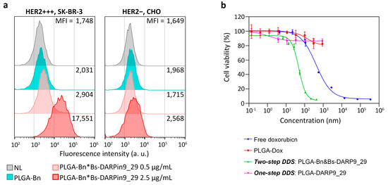 Targeted delivery and cytotoxicity of two-step DDS, PLGA-Bn*Bs-DARPin9_29. (a) Flow cytometry of SK-BR-3 and CHO cells, labeled with PLGA-Bn*Bs-DARPin9_29 nanostructures in the fluorescence channel FL4 corresponding to Nile Blue fluorescence. (b) Cytotoxicity of free doxorubicin, non-targeted PLGA loaded with doxorubicin, and targeted one-step DDS (PLGA-DARPin9_29) and two-step DDS (PLGA-Bn*Bs-DARPin9_29) based on PLGA particles, obtained with the MTT assay.