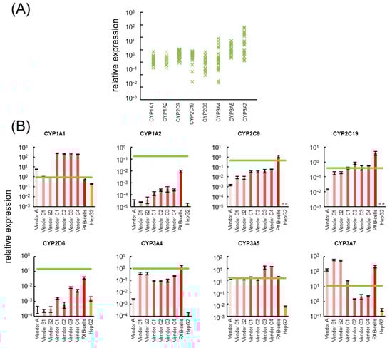 In HepG2 cells, the expression levels of CYP1A2, CYP2C9, CYP2C19, CYP2D6, and CYP3A4 were not detected or one to five orders of magnitude lower than average values of cryoheps.