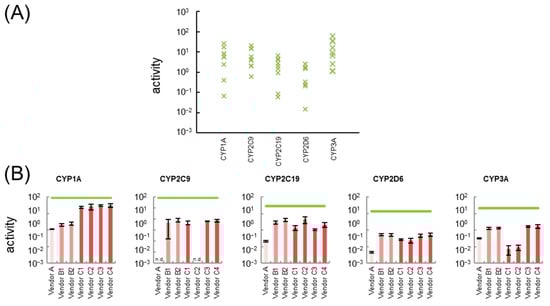 In hiPSC-Heps from vendor A, the expression levels of CYP1A1 and CYP3A5 were the same as those of cryoheps. Meanwhile, the expression levels of CYP1A2, CYP2C9, CYP2C19, CYP2D6, and CYP3A4, which are major CYP subfamilies, were one to four orders of magnitude lower than those average values in cryoheps. Lastly, the expression levels of CYP3A7, known as the primary fetal CYP3A enzyme, were one orders of magnitude higher than those of cryoheps. The activity levels of CYP2C9 was not detected, and those of other CYPs were two orders of magnitude lower than average value of cryoheps.