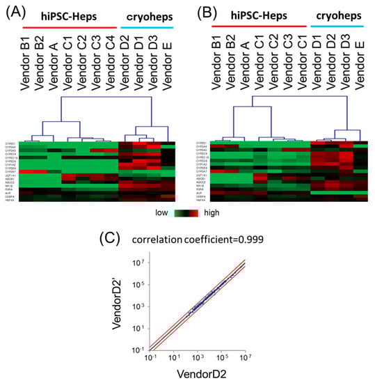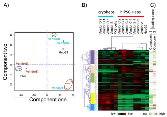 The aforementioned results suggested that the focused microarray assay is a reliable method for gene expression measurement. Thus, using the expression data from the focused microarray assay, we compared the characteristics of the cell types through PCA and hierarchical clustering. For comparison with alternative cells, cryoheps from wendor D, which tends to have high CYPs expression, and vendor E, which tends to have low CYPs expression, were used for analysis. In the PCA score plot, PC1 grouped cryoheps and PXB-cells, against hiPSC-Heps and HepG2 cells (Figure 4A). Meanwhile, PC2 grouped hiPSC-Heps from vendors A and B against hiPSC-Heps from vendor C. The hierarchical clustering of the samples generated a cluster including cryoheps and PXB-cells and a cluster including hiPSC-Heps and HepG2 cells (Figure 4B). These suggested that PXB-cells and cryoheps have similar characteristics. Likewise, hiPSC-Heps and HepG2 cells have similar characteristics. In addition, PC2 suggested that hiPSC-Heps from vendors A and B and hiPSC-Heps from vendor C have different characteristics.